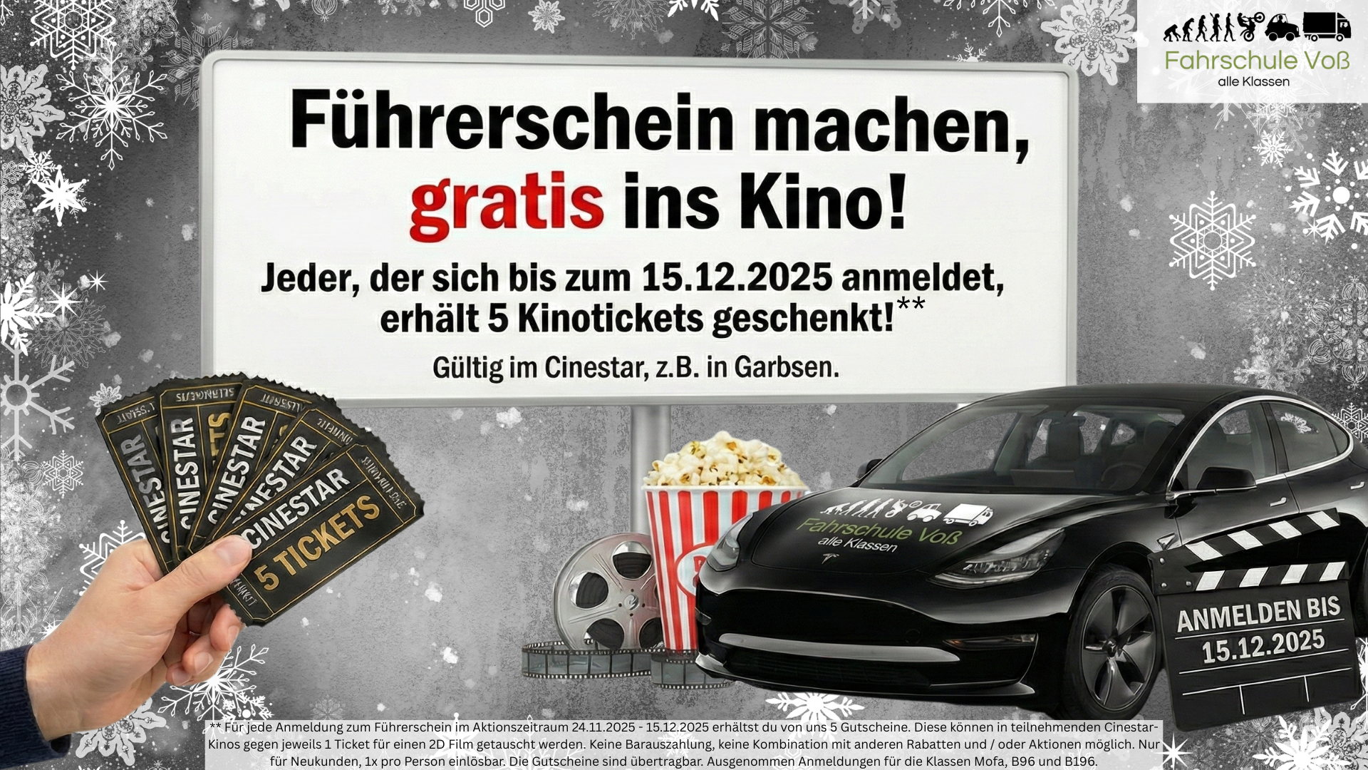 ** Für jede Anmeldung zum Führerschein im Aktionszeitraum 24.11.2025 – 15.12.2025 erhältst du von uns 5 Gutscheine. Diese können in teilnehmenden Cinestar-Kinos gegen jeweils 1 Ticket für einen 2D Film getauscht werden. Keine Barauszahlung, keine Kombination mit anderen Rabatten und / oder Aktionen möglich. Nur für Neukunden, 1x pro Person einlösbar. Die Gutscheine sind übertragbar. Ausgenommen Anmeldungen für die Klassen Mofa, B96 und B196.